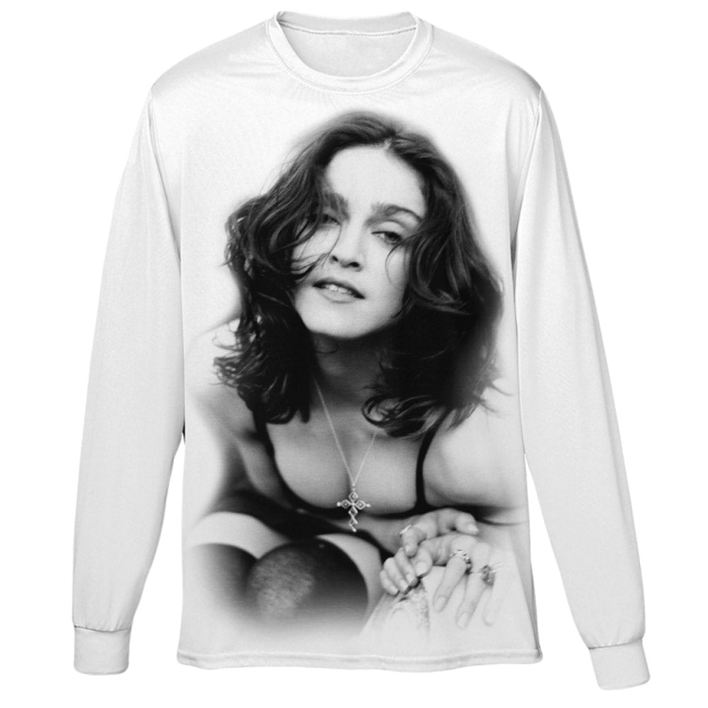 Madonna Photo from Like a Prayer is printed in a large oversized print on the front. 30th Anniversary Like a Prayer logo is printed on the upper back. White.