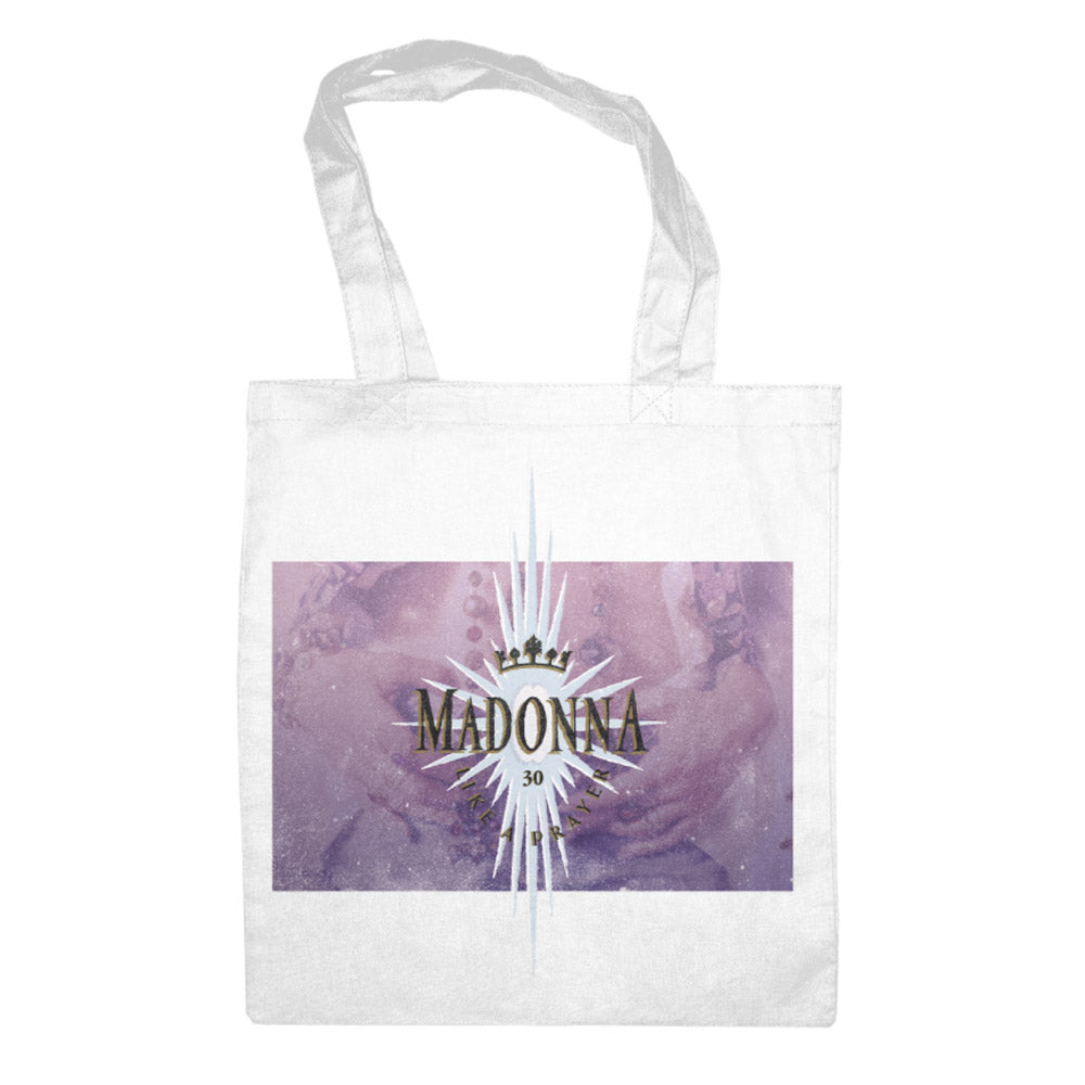 Madonna Like A Prayer 30th Anniversary Artwork with a distressed purple tint on the front of a 100% Cotton canvas tote bag