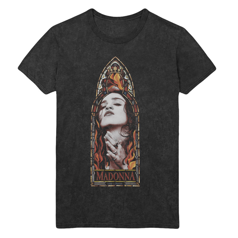 Like a Prayer Madonna printed as though on a stained glass panel on the front of 100% cotton mineral black washed tee. No 2 shirts are identical.