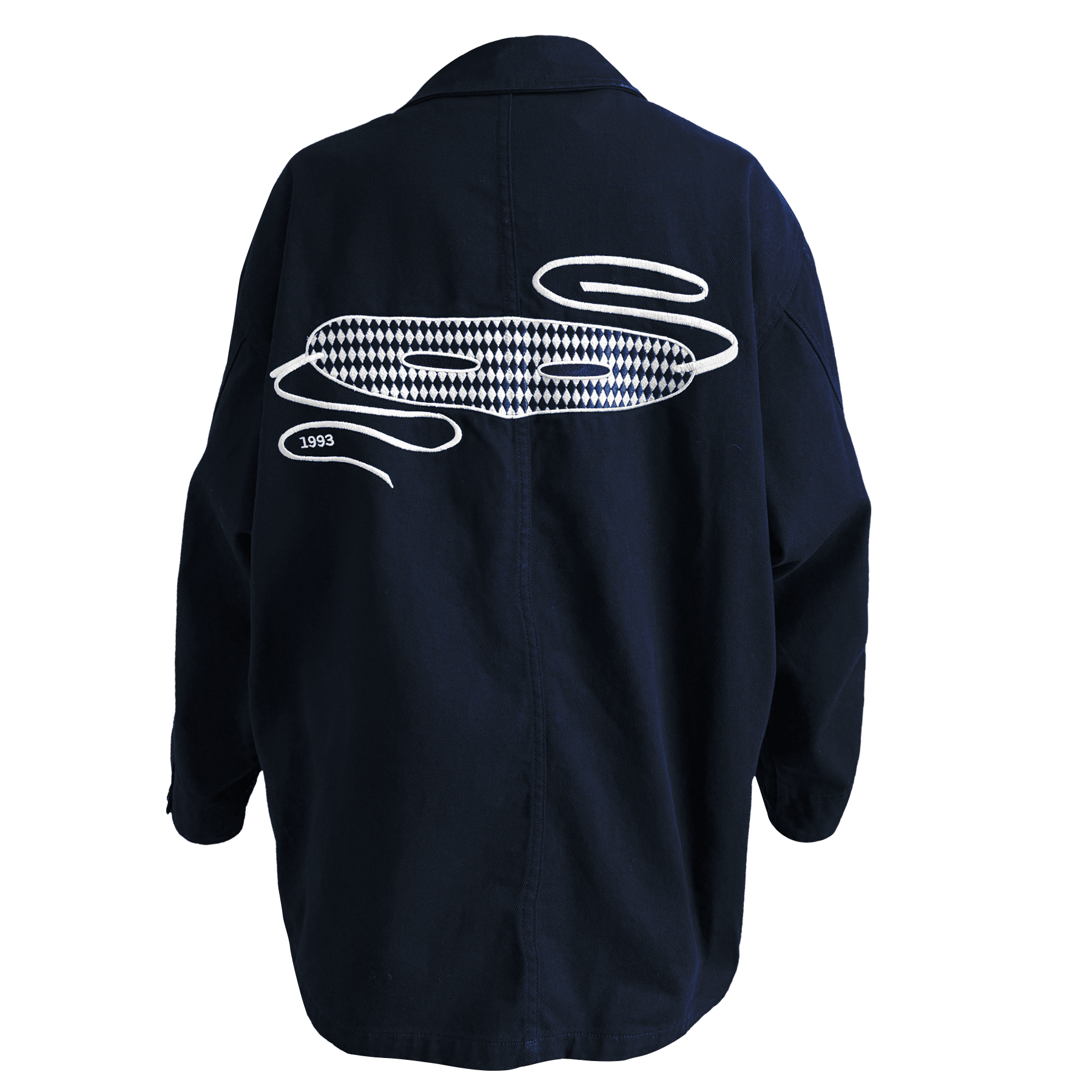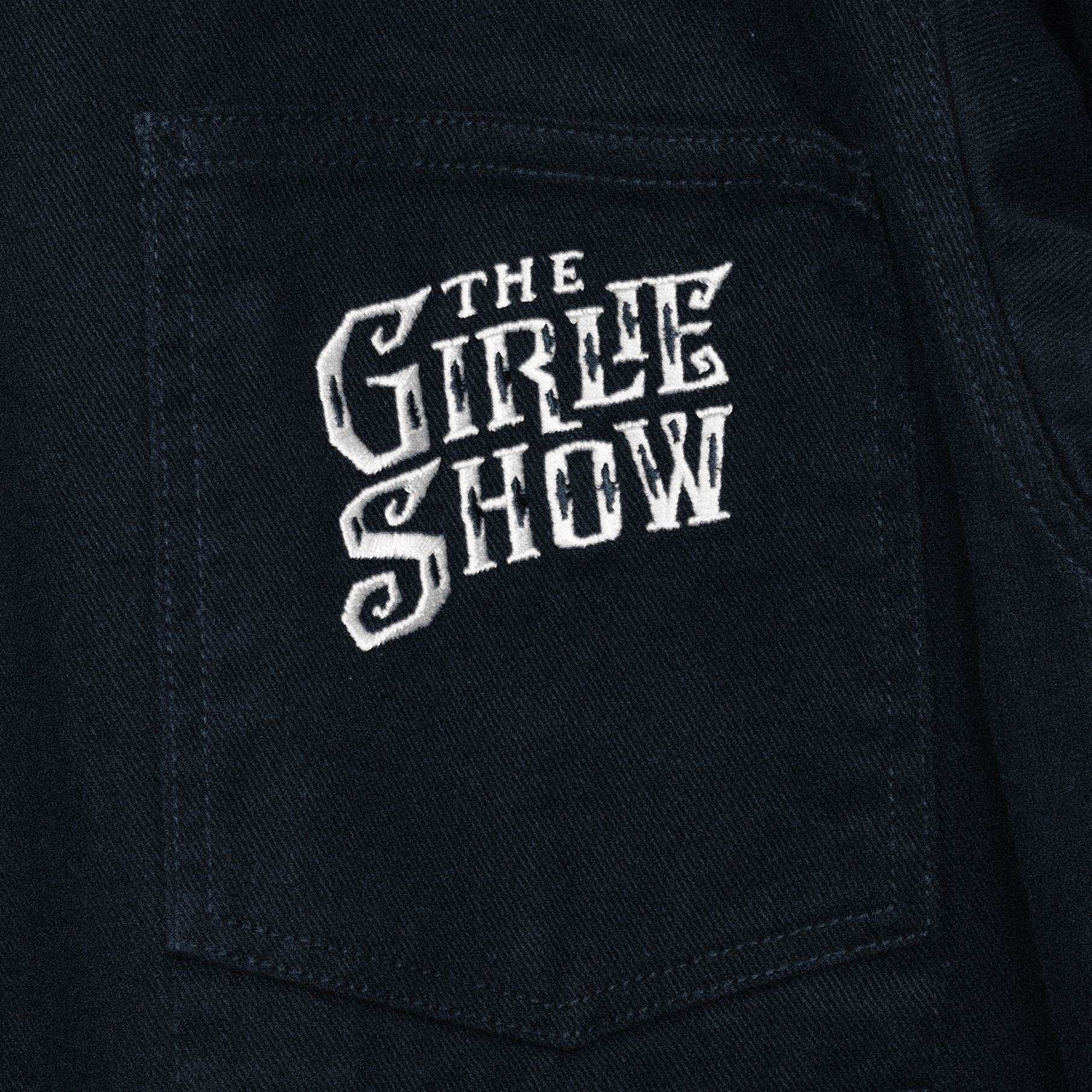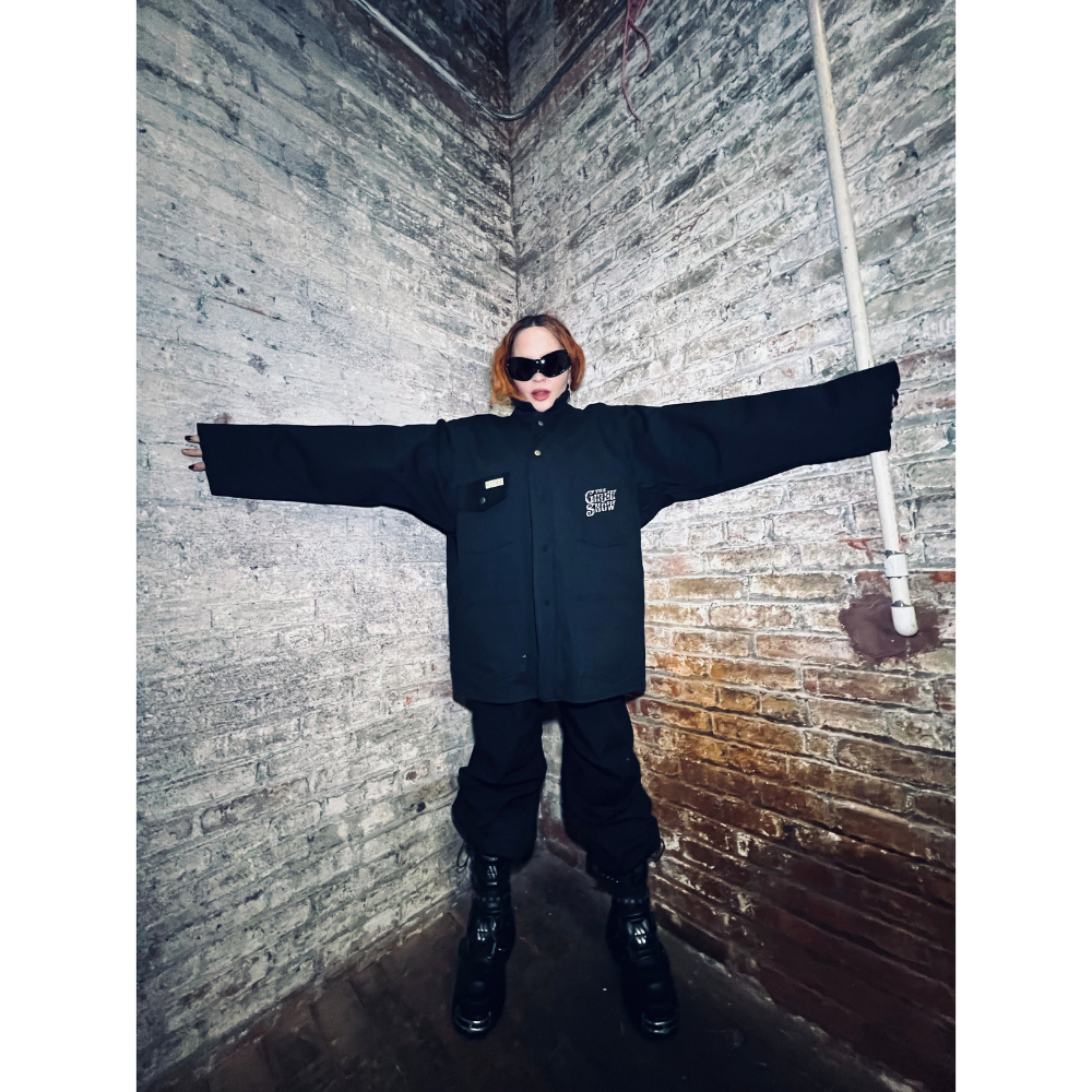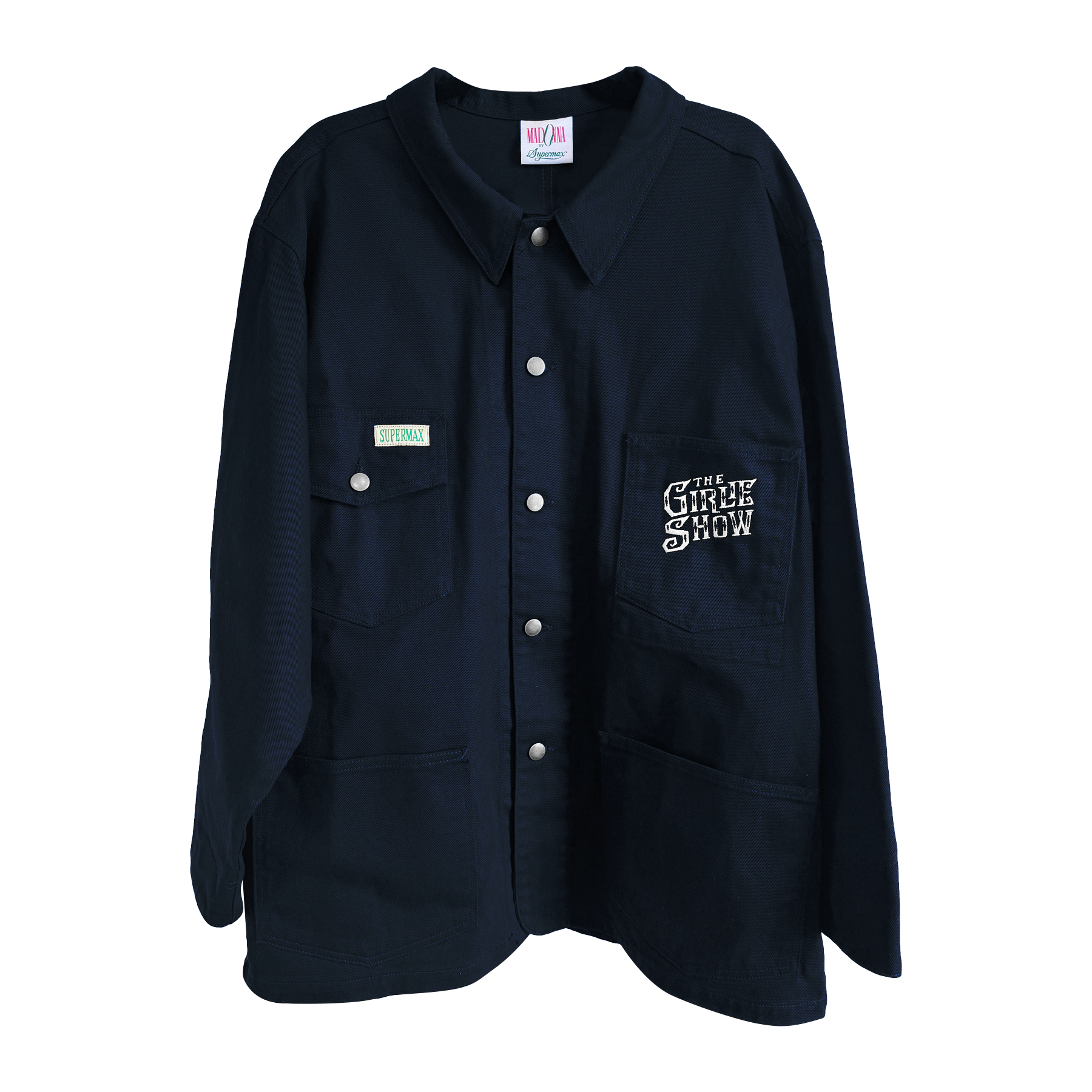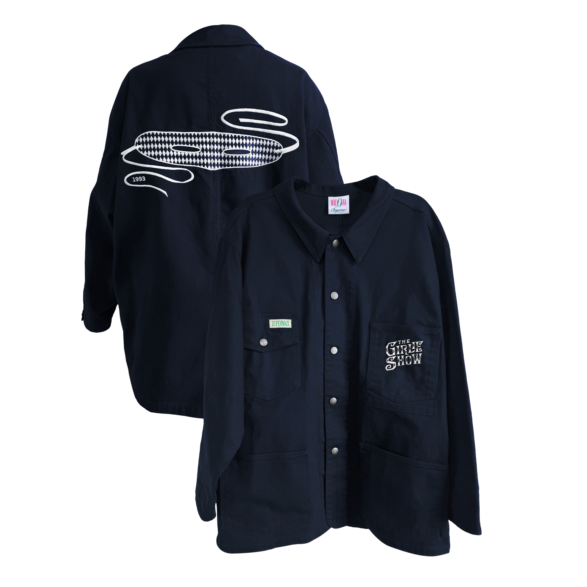 Exact reproduction of the mythic Girlie Show Tour embroidered jacket, designed with the original manufacturer, SUPERMAX HARDWARE, in Los Angeles. Jacket features embroidered Girlie Show Tour logo on left breast and large embroidered Erotica mask across the back. Originally made in 1992, only 25 of these jackets were ever produced for Madonna and her dancers. The reproduction was made using Madonna’s personal jacket that she has preserved in her archive for 30 years. Preshrunk, oversized black-blue bull denim studio work jacket, 100% cotton denim.